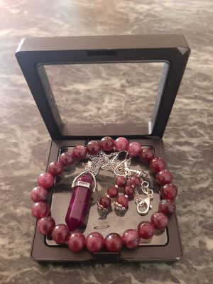 A passionate and refined set crafted from natural Garnet, enhanced with 925 sterling silver details. Featuring a bracelet, earrings, and pendant with chain, this jewelry set is a true statement of style and feminine strength.