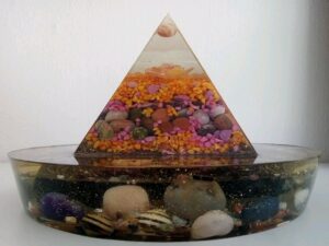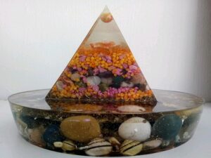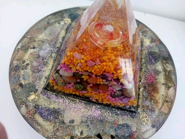 2950 g, contains epoxy resin, metal, copper wire, various crystals, shungite, coloured snail shells and other decorative elements. It is a one-of-a-kind product.On order I can make similar ones, not identical.